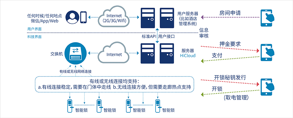 在本產品的使用中,您無需另外配置無線網關器,無線網關模組在鎖體中實現控制功能與無線上網功能;與電子鎖配套的集群 管理系統(tǒng),使用方可以獲取每一把電子鎖的管理權限和狀態(tài)數據;電子鎖的開啟與閉合狀態(tài)實時的顯示在后臺管理系統(tǒng)上;通過 前臺實現開鎖授權與退房制約管理,客人與前臺可以實現遠程電子登記入住。
